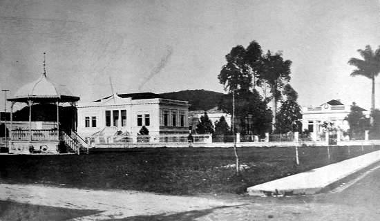 Esse prédio à esquerda, atrás do coreto, foi o Grupo Escolar de São Vicente, a que chamavam de Grupão. Estudei lá de 1970 a 1972 – pré-primário, primeiro e segundo anos. Dona Rosa Feiz foi minha professora, lembro com carinho. Me comportava mal no recreio, já isso não deu muito certo.
